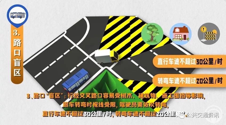 3、路口“盲區(qū)”:行經(jīng)交叉路口容易受樹木、建筑物、施工圍擋等影響,跟車轉(zhuǎn)彎時視線受限,駕駛員要依次轉(zhuǎn)彎,直行車速不超過30公里/時,轉(zhuǎn)彎車速不超過20公里/時。