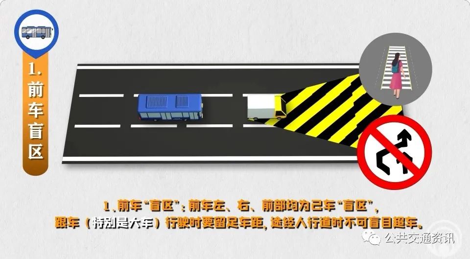 1、前車“盲區(qū)”:前車左、右、前部均為己車“盲區(qū)”,跟車(特別是大車)行駛時要留足車距,途經(jīng)人行道時不可盲目超車。