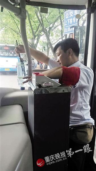 等待發(fā)車間歇,只見公交車司機拿著一把長刷子在刷瓶身。刷干凈后,直接扭開瓶蓋將臟水放掉,然后從上面倒干凈水。