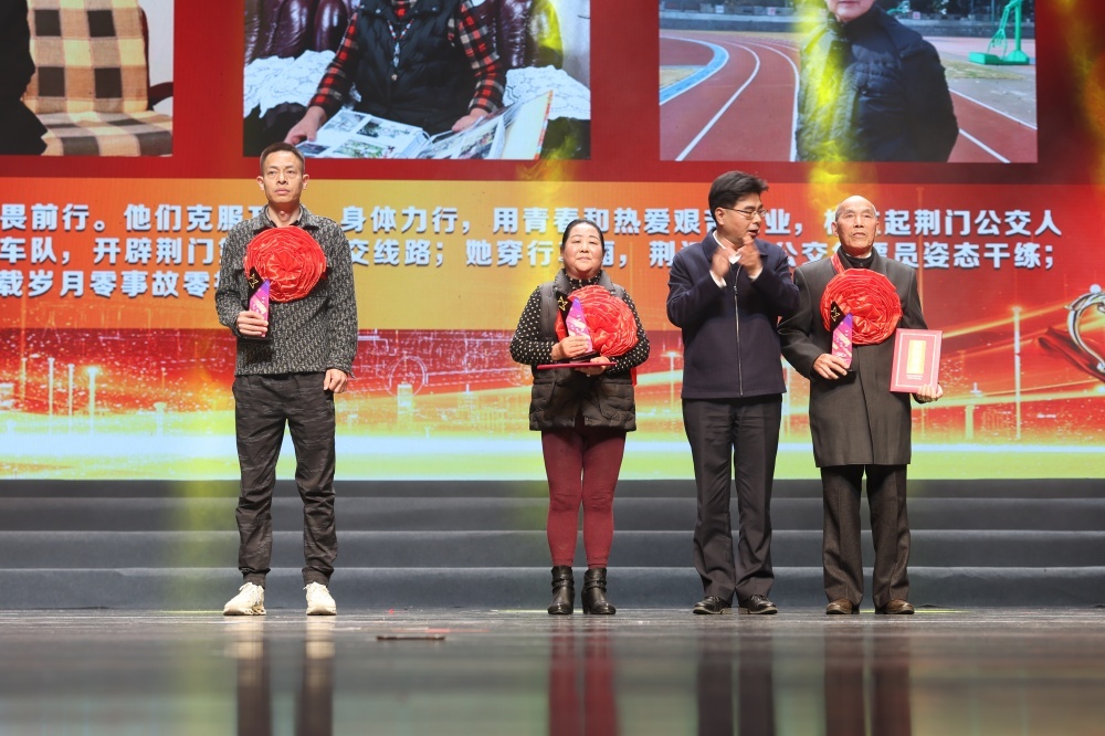 頒獎環(huán)節(jié),在荊門公交發(fā)展歷程中做出過杰出貢獻(xiàn)的8名“時代標(biāo)兵”人物,被授予“崢嶸歲月”“風(fēng)華正茂”“無悔青春”時代標(biāo)兵,感謝他們一路走來的無私付出和拼搏奮斗。