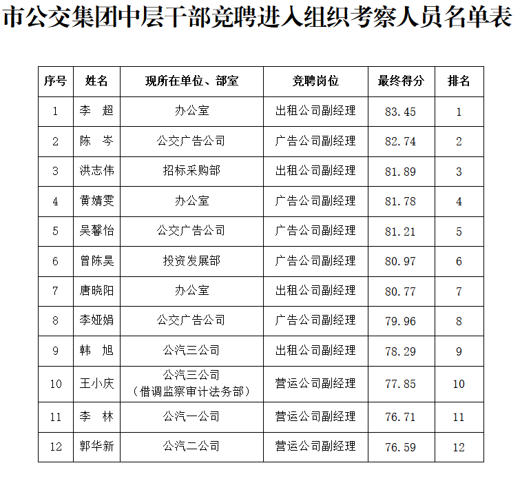 市公交集團(tuán)中層干部競聘進(jìn)入組織考察人員名單公示