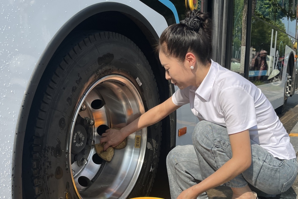 大太陽底下,他仔細(xì)檢查每一處,就為了保障公交車能順順當(dāng)當(dāng)跑。